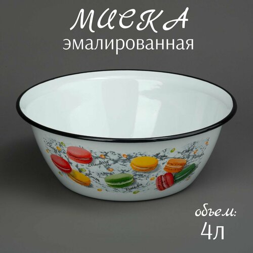 Миска эмалированная 4 л, с рисунком, белая, салатник большой