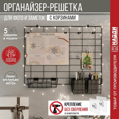 Мудборд с корзинками, органайзер настенный, 60,5х45,5 см. Черный муар