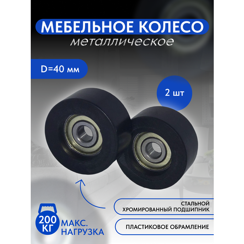 Колесо мебельное металлическое 2 ш, на металлическом подшипнике с наружным диаметром 40 мм, толщиной 20 мм и диаметром втулки 10 мм.