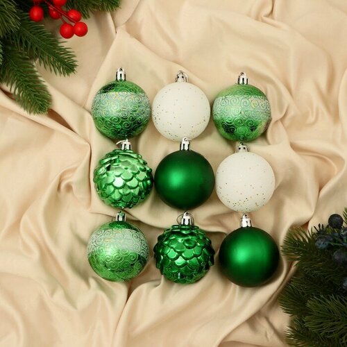 Набор шаров пластик d-5,5 см, 9 шт "Гармония" шишки завитки, зелёный белый 9510244