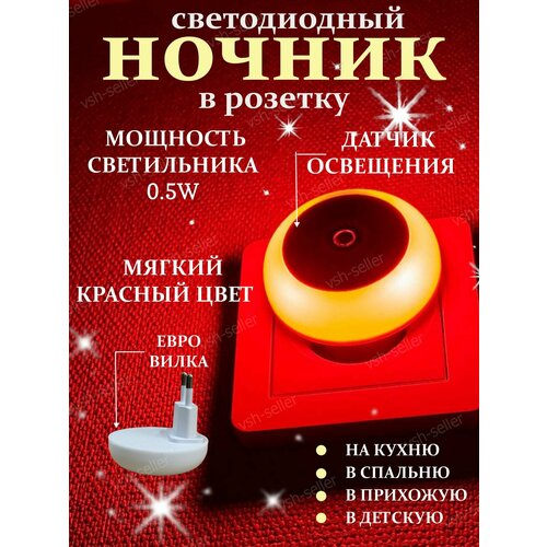Светильник ночник в розетку с датчиком освещенности, розово-красный свет