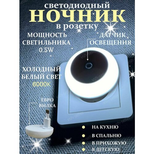 Светильник ночник в розетку с датчиком освещенности, холодный белый свет, 6000К