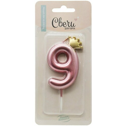Свеча Цифра, 9 Золотая корона, Розовый, Металлик, 7 + 3 см, 1 шт. с держат.