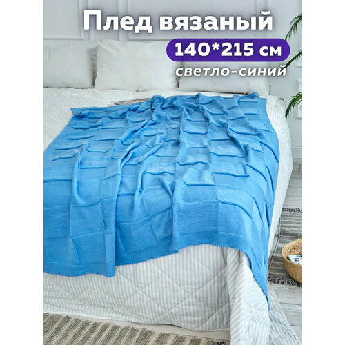 Плед-покрывало вязаный на 1.5-спальную кровать хлопковый , плед на диван взрослый AlmaForHome ByRoyalDream 140х215 см / темно-голубой