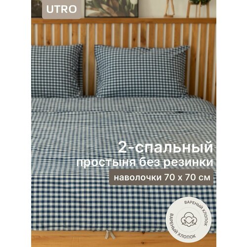 Комплект постельного белья UTRO из вареного хлопка, Синий клетчатый, Двуспальный, без резинки, 70 x 70