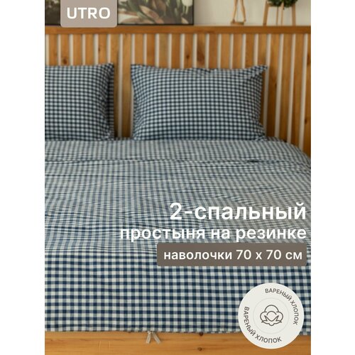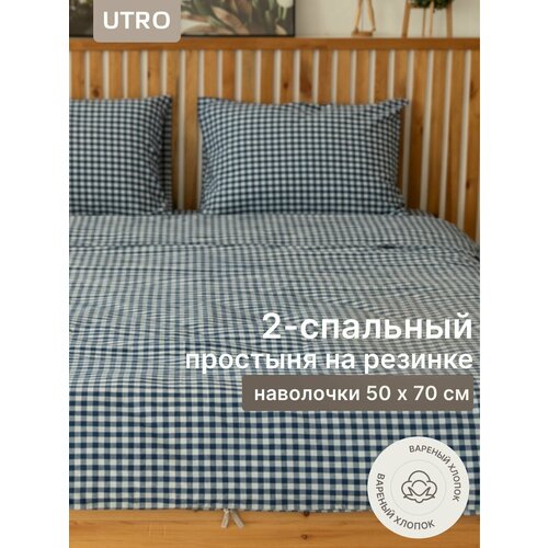 Комплект постельного белья UTRO из вареного хлопка, Синий клетчатый, Двуспальный, на резинке, 50 x 70