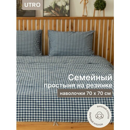 Комплект постельного белья UTRO из вареного хлопка, Синий клетчатый, Семейный, на резинке, 70 x 70