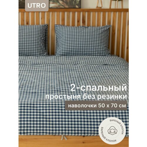 Комплект постельного белья UTRO из вареного хлопка, Синий клетчатый, Двуспальный, без резинки, 50 x 70