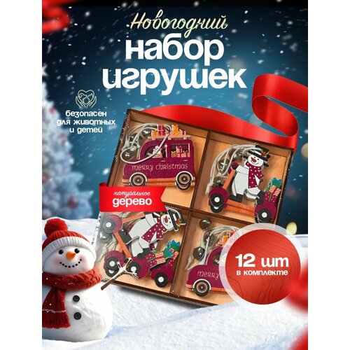 Деревянные новогодние ёлочные игрушки "Снеговик", набор 12 штук