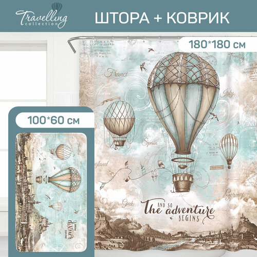 Штора для ванной, 180*180, набор с ковриком 100*60*1,5см, TRAVELLING AIR