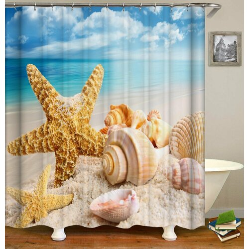 Штора (занавеска) для ванной / душа водоотталкивающая тканевая с кольцами 180 x 180 см Пляж и ракушки 2