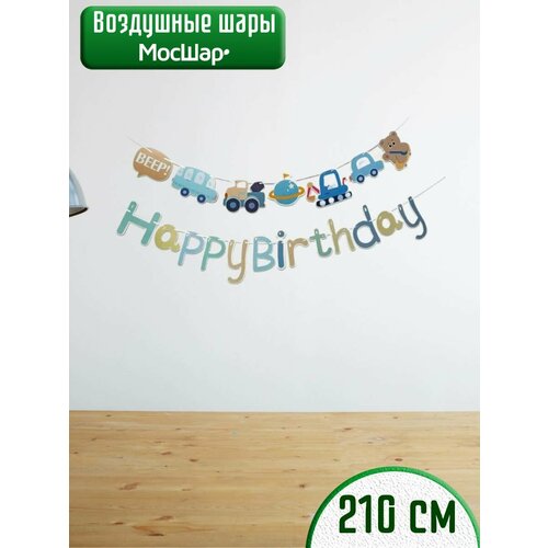 Гирлянда бумажная растяжка День Рождения с машинками, 210 см, МосШар