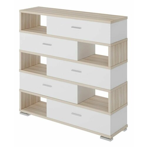 В стеллаже три открытых ниши для хранения и три выдвижных ящика.
