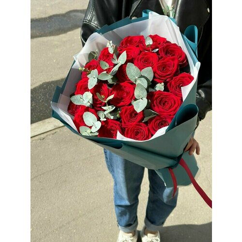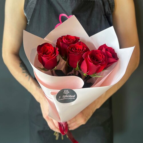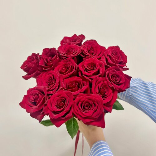 Букет живых цветов из 15 красных роз под ленту, Эквадор 50 см | Пять цветов - быстрая доставка 964362742