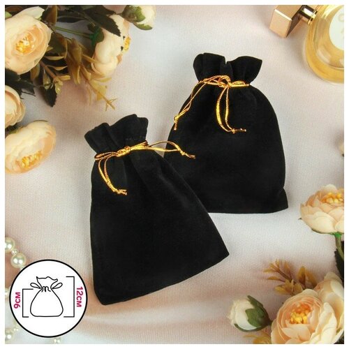 Мешочек бархатный, 9*12, цвет чeрный с золотым шнурком 50 шт