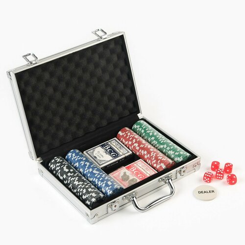 Покер в металлическом кейсе (карты 2 колоды, фишки 200 шт с/ном, 5 кубиков), 20.5 х 29 см