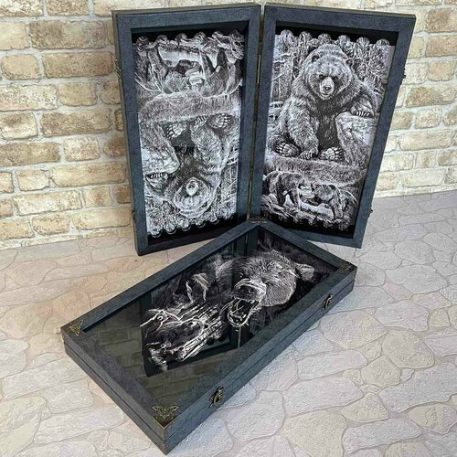 Нарды подарочные "Яростный Медведь", большие, игровое поле под каленым стеклом, из натурального дерева, обтянуты экокожей премиум класса, фишки и игральные кости в комплекте