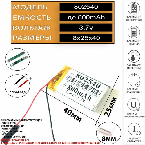 Аккумулятор 800mAh для клавиатуры, игровой компьютерной мышки 3.7v 8мм на 25мм на 40мм (универсальный акб / li-pol батарея)
