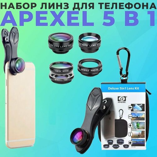 Объективы 5в1 Apexel (FishEye 190 ФотолинзаX2 Макро x15 Широкоугольная 0.63 Поляризационный светофильтр)