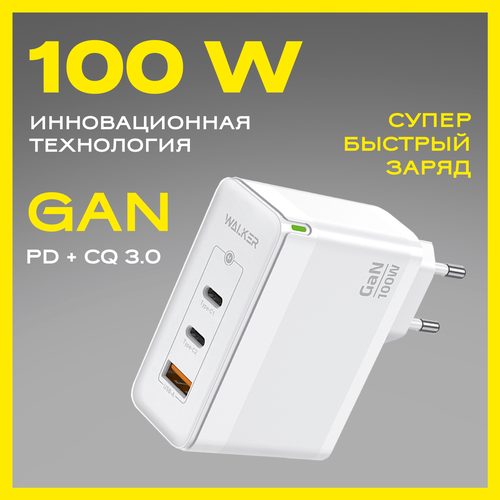 Зарядное устройство для телефона, WALKER, WH-47 GaN, белое, 100Вт, USBx1/Type-Cx2, QC 3.0+PD // зарядка для айфона, блок питания type c, зарядка type c
