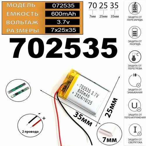 Аккумуляторная батарея 600mAh 3.7v 2pin Li-Pol 7*25*35 2 провода универсальная
