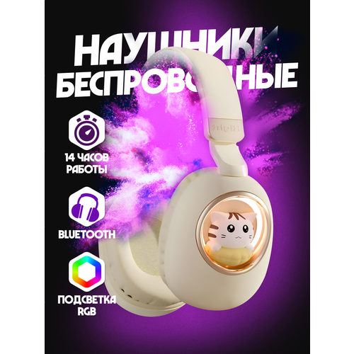 Беспроводные наушники / Детские наушники с подсветкой и микрофоном / Бежевые