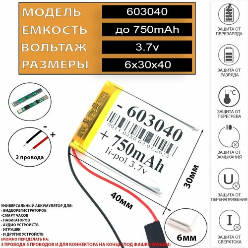 Аккумулятор 750mAh для видеорегистратора 3.7v 2 провода (батарея на видеорегистратор универсальная)