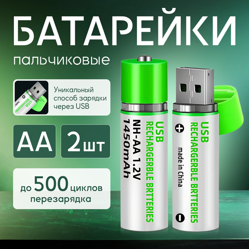 Аккумуляторные батарейки USB зарядка, AA, NiMH, 500 циклов заряда, 1450 mAh, 2шт