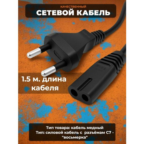 Кабель Питания 220В медный с сечением 2х0,75mm - 1,5м IEC C7 - "восьмерка" для электротехники, бытовой техники и Игровых консолей PS3 PS4 PS5 Xbox