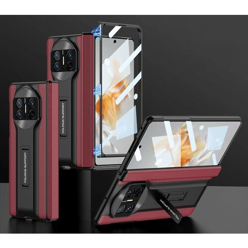 Магнитный чехол бампер MyPads для Huawei Mate X3 на пластиковой основе из качественной импортной кожи с прозрачной крышкой на экран телефона в крас.