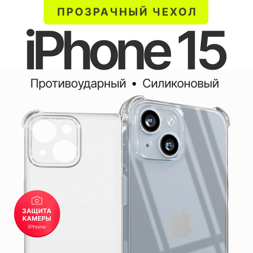 Чехол прозрачный противоударный с защитой камеры для iPhone 15 ( на айфон 15 ) силиконовый