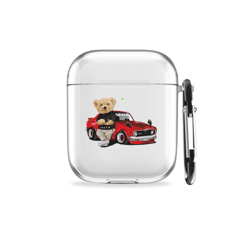 Силиконовый чехол Mcover для беспроводных наушников AirPods 1/2, с карабином, глянцевый, Мишка с машиной