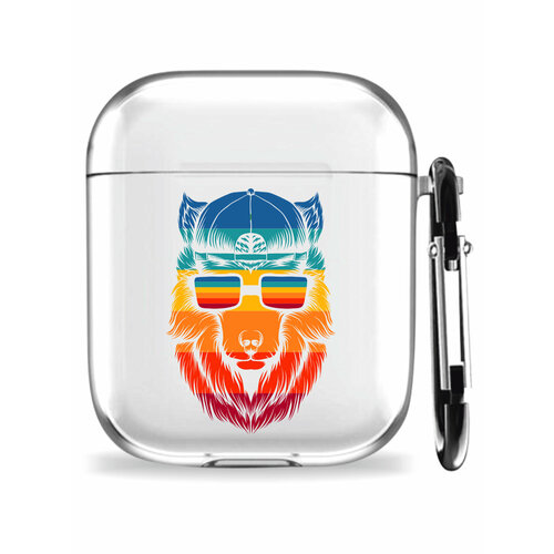 Силиконовый чехол Mcover для беспроводных наушников AirPods 1/2, с карабином, глянцевый, Волк в очках разноцветный