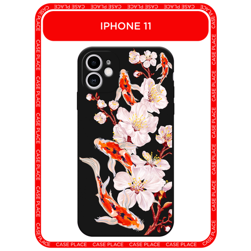 Черный матовый чехол на Apple iPhone 11 / Айфон 11 с принтом Карпы и сакура