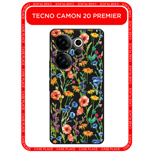 Черный матовый чехол на Tecno Camon 20 Premier / Техно Камон 20 Премьер с принтом Маки и васильки фон