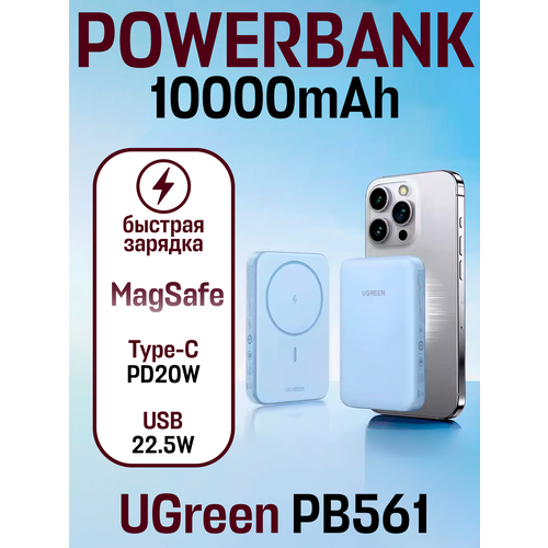 Внешний аккумулятор UGreen Power Bank PB561, 10000mAh, MagSafe светло-синий