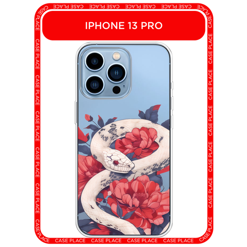 Чехол на Apple iPhone 13 Pro / Айфон 13 Про с принтом Белая змея в цветах, прозрачный