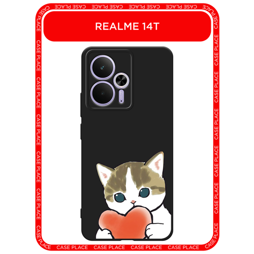 Черный матовый чехол на Realme 14T / Реалми 14Т с принтом Котик с сердечком