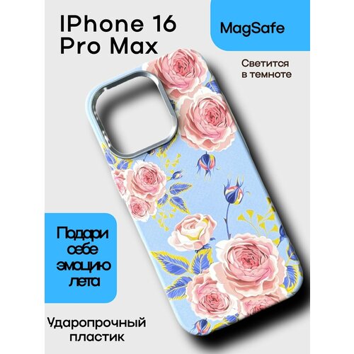 Чехол на IPhone 16 Pro Max с MAGSAFE женский из ударопрочного пластика с цветами и защитой камеры голубой