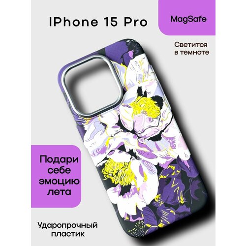 Чехол на IPhone 15 Pro с MAGSAFE женский из ударопрочного пластика cс цветами и защитой камеры фиолетовый