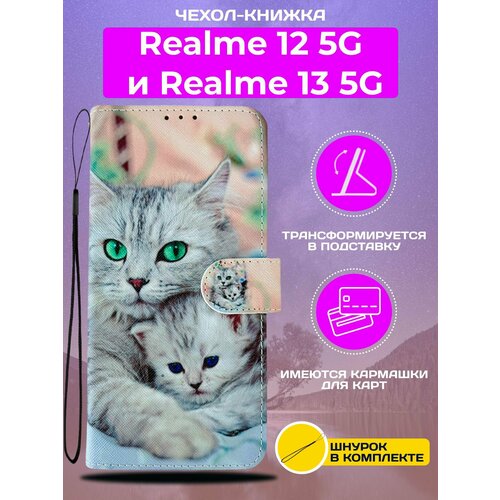 Чехол книжка wallet case на Realme 12 5G и Realme 13 5G / Реалми 12 5G и Реалми 13 5G с рисунком (Кошка с котёнком)