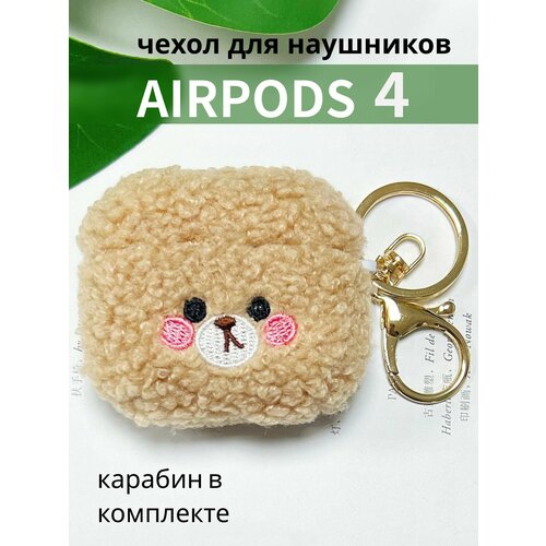 Чехол для наушников AirPods 4 (2024) меховой "Плюшевый мишка" с кольцом и карабином, светло-коричневый