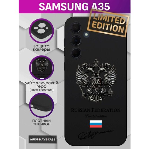 Чехол на Samsung A35 с Графитовым металлическим Гербом России Limited Edition