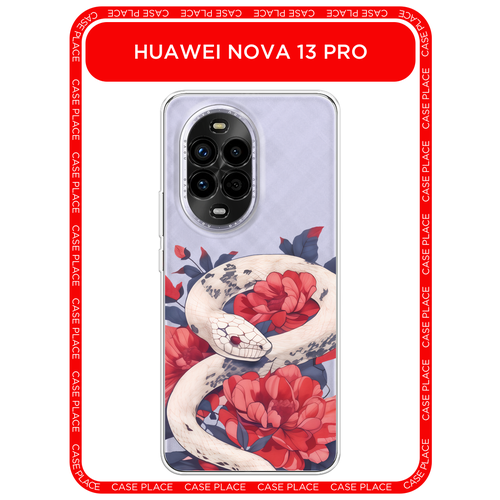 Чехол на Huawei Nova 13 Pro / Хуавей Нова 13 Про с принтом Белая змея в цветах, прозрачный