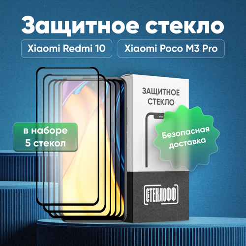 Набор защитных стекол для Xiaomi Redmi 10 и POCO M3 Pro c полным покрытием, серия Стеклофф Base, 5 шт