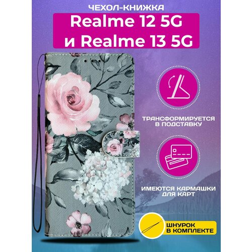 Чехол книжка wallet case на Realme 12 5G и Realme 13 5G / Реалми 12 5G и Реалми 13 5G с рисунком (Розы на сером)