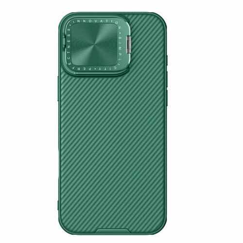 Чехол зеленого цвета (Dark Green) с металлической откидной крышкой для камеры от Nillkin на iPhone 16 Pro Max, серия CamShield Prop Case