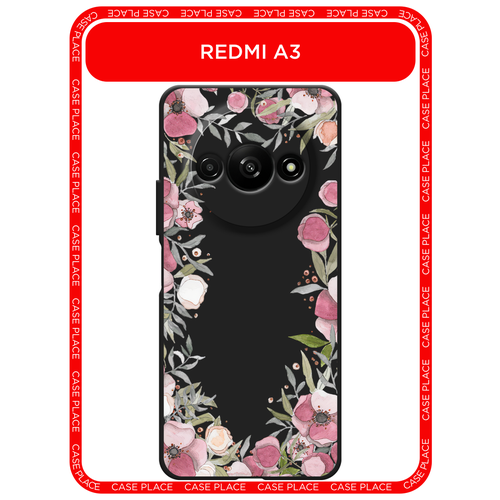 Черный матовый чехол на Xiaomi Redmi A3/A3x/Poco C61 / Сяоми Редми А3/A3x/Поко С61 с принтом Розовая цветочная рамка