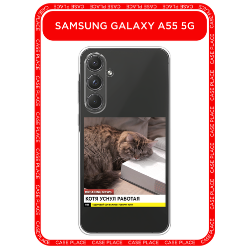Чехол на Samsung Galaxy A55 5G / Самсунг Галакси А55 5G с принтом Кот уснул работая, прозрачный