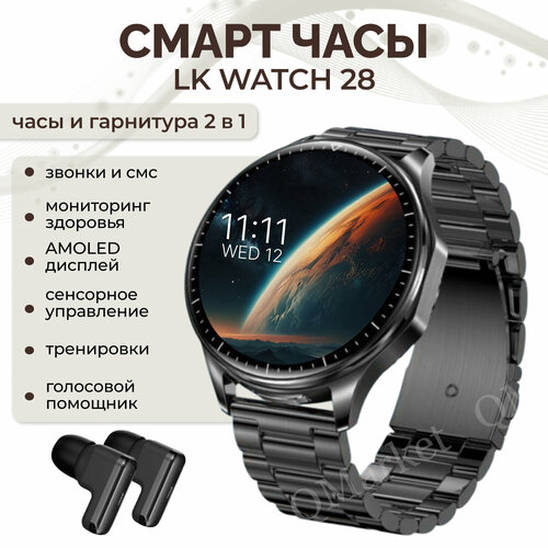 Cмарт часы LK WATCH 28 / Умные часы c наушниками iOS Android Bluetooth Звонки Уведомления Наушники, черные